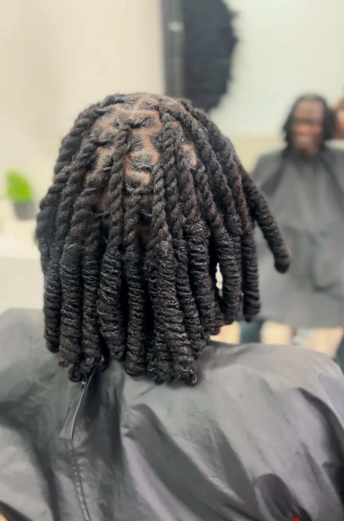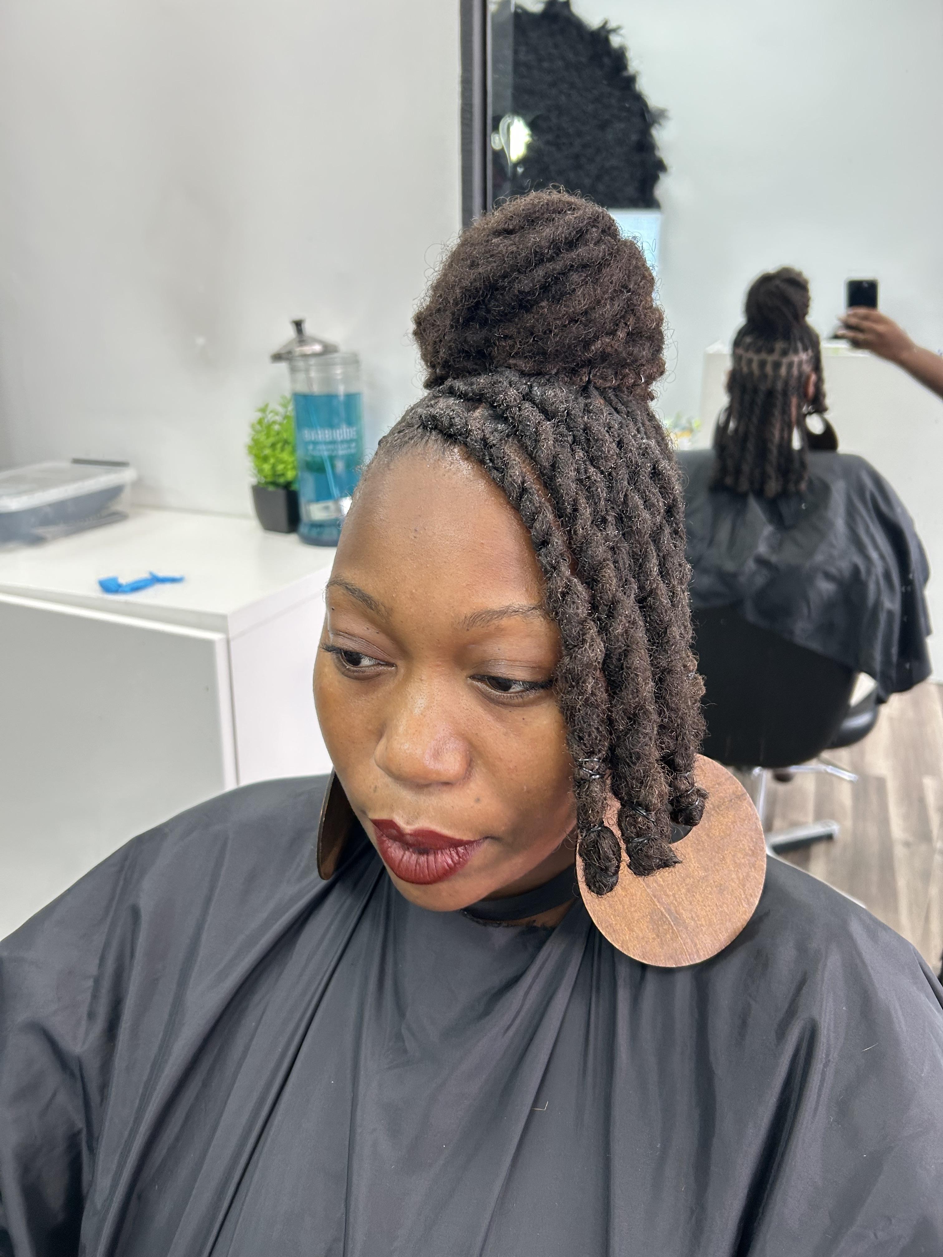 A typical loc retwist or twist maintenance at Joycey Salon usually takes about 1 to 2 hours, depending on the length, thickness, and condition of your locs. If you have a larger or thicker head of locs, it may take a little longer. During your appointment, we ensure your locs are properly retwisted or palm-rolled for a fresh, neat look.